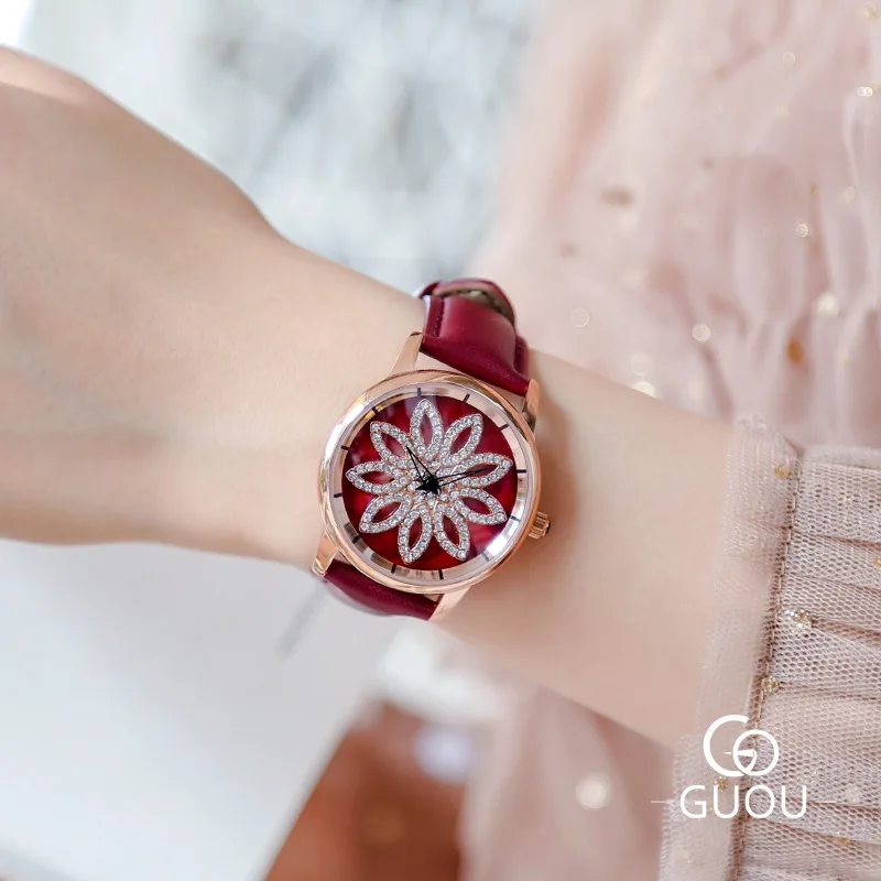 HIGH QUALITY 6 Colors! Women Real Leather Watches Lady Shining Rotation Dress Watch Big Diamond Stone Wristwatch